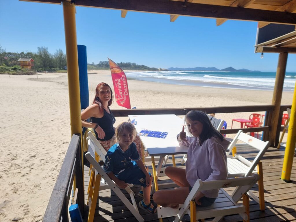 Le lendemain, nous retrouvons Ninon et Luiz chez le réparateur de téléphone. Le mien ne se rallume plus, celui de Sylvain semble aussi montrer quelques signes de faiblesse. Ninon nous sert de traductrice. Nous laissons nos portables pour la journée afin qu’ils prennent un bain chimique afin d’éviter la corrosion. En attendant, nous passons la journée sur la plage. Après le travail scolaire, les enfants font du body-board, Gaspard parvient petit à petit à se remettre à l’eau et à prendre du plaisir. Je m’installe sur le sable avec ma guitare et profite de cette dernière journée dans cette petite ville de Garopaba qu’on aime tant.