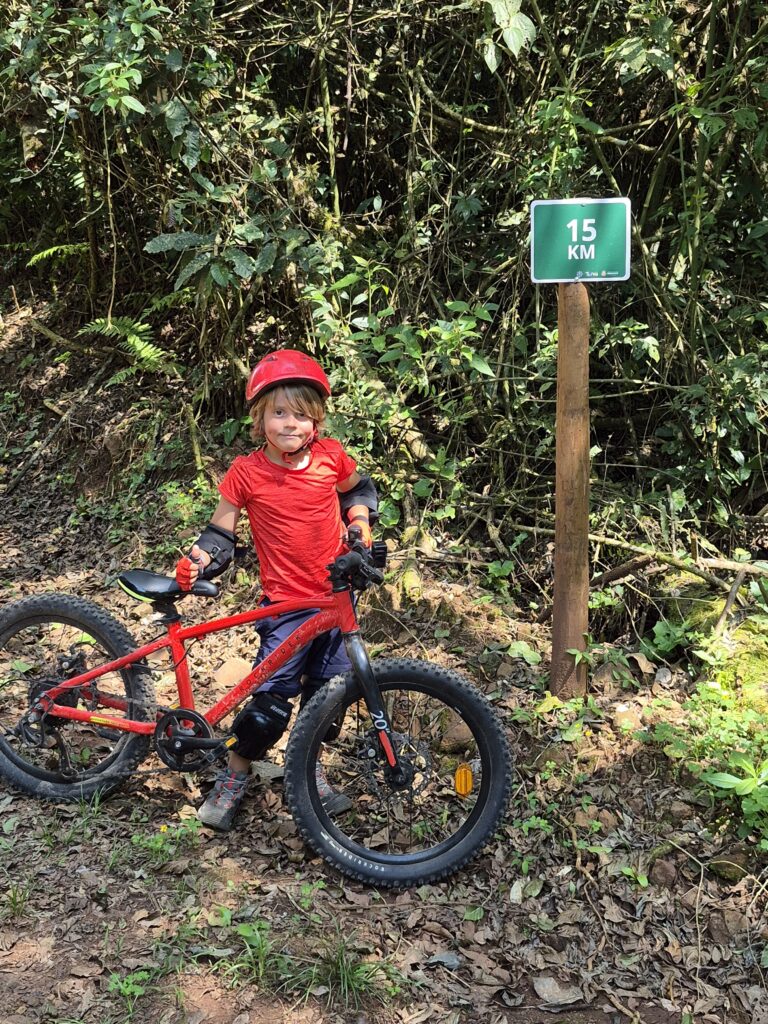 Lorsque nous arrivons, nous sommes très surpris d’apprendre que l’entrée du parc naturel est payante et que nous devons obligatoirement être suivis d’un driver du parc en 4×4 qui nous distribuera de l’eau si besoin et pourra mettre nos vélos sur la remorque quand nous en auront marre. On a beau expliquer que ce n’est pas nécessaire, on n’a pas vraiment le choix. Pour couronner le tout, nous devons obligatoirement mettre casque, genouillères et coudières…question d’assurance me dit-on à l’accueil! Je vous laisse imaginer la tête de Sylvain lorsqu’il a dû s’habiller comme robocop pour faire du vélo, sur une piste certes, mais très propre et sans difficulté! Les 15km à parcourir sont vraiment agréables. Nous avons croisé des coatis, un cobra corail, des papillons par centaines, des oiseaux immenses. Quelques côtes font un peu peiner Gaspard mais il parvient tout de même au bout de cette piste sans monter dans le 4×4! Au bout, les chutes. Malheureusement ce jour-là, le fleuve était trop haut et les chutes presque invisibles. Selon la hauteur du Rio Uruguay, les chutes peuvent être invisible ou mesurer jusqu’à 30 mètres de haut! La balade vaut malgré tout le coup, une guide présente sur la rive nous donne pas mal d’explications sur le fleuve, la faune et la flore locale et même sur la retraite des Brésiliens! En effet, elle nous explique qu’elle fait ce job alors qu’elle est retraitée afin de réunir assez d’argent pour voyager en Europe. Le durée de cotisation obligatoire au Brésil est entre 18 et 35 ans selon la pénibilité du travail. On aimait déjà beaucoup ce pays, mais sur ce coup, il marque encore un point!