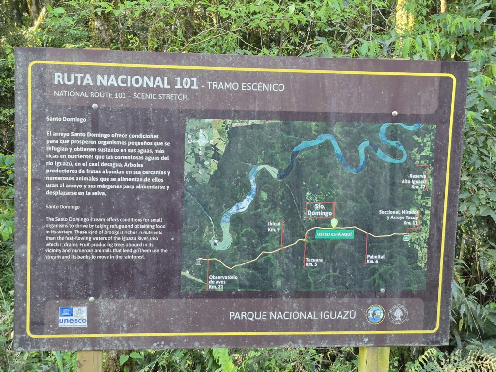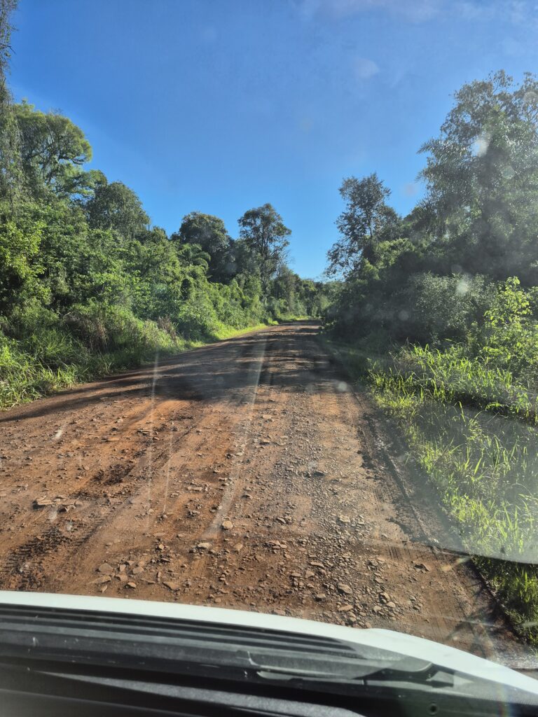 Nous traversons donc la belle province de Missiones dans laquelle nous aurions aimé passer plus de temps. Le paysage est verdoyant et vallonné, une petite appendice argentine coincée entre le Brésil et le Paraguay qui contient les deux grandes réserves naturelles de Yaboty et d’Iguazu et abrite de nombreuses espèces animales. Nous traversons la réserve d’Iguazu par la Nationale 101, qui se termine par 30km de piste de terre en pleine jungle. C’est vraiment très beau et encore une fois, on est seuls. Inkaiko est secoué malgré mes efforts pour éviter trous et bosses, cela fait beaucoup rire les enfants!