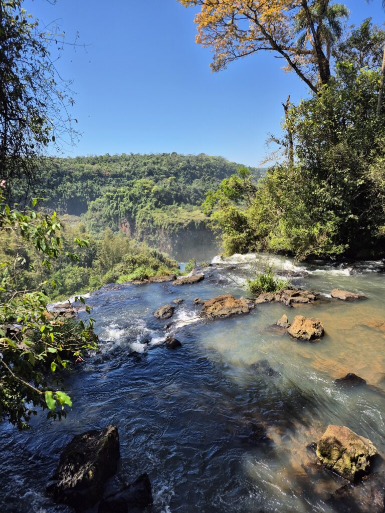Nous arrivons au Parc national d’Iguazu et choisissons d’emprunter le sentier inférieur le matin, à l’inverse de la majorité des visiteurs. Nous avons de la chance, la fréquentation est faible. Nous avons beaucoup d’espace et de temps pour admirer les centaines de cascades qui jaillissent de toute part. Le spectacle est saisissant, on se croirait dans le jardin d’Eden avec ces longs rideaux blancs qui coulent sans fin le long des parois rocheuses habillées de végétation d’un vert éclatant. Le bruit de l’eau est apaisant et continu, chaque point de vue est plus beau que le précédent, c’est un régal pour les yeux! Nous continuons la visite par le sentier supérieur. L’intensité va crescendo au fur et à mesure que nous avançons. Une fois les deux sentiers terminés, nous montons dans le petit train qui mène tout en haut du site, au niveau du Rio qui coule paisiblement avant de s’écrouler avec force et fracas dans la gigantesque faille pour former ces cascades immenses. Le Rio semble presque immobile (ce n’est qu’une illusion car le débit et le courant sont très importants). C’est une rivière large et paisible entourée d’une dense végétation comme on commence à avoir l’habitude de voir. Je m’imagine les premiers explorateurs, descendant la rivière avec un sentiment naïf de toute puissance sans imaginer ce qui les attend quelques mètres plus loin et au moment de s’en rendre compte, ne rien pouvoir faire pour empêcher l’embarcation d’être emportée par ces eaux sauvages et puissantes. Cela s’est peut-être passé, ou peut-être pas, peu importe. J’aime rêvasser en me racontant ces histoires, en imaginant ce qu’était ce lieu avant que l’empreinte coloniale ne vienne le transformer. Cependant, malgré les passerelles et autres installations touristiques, le lieu n’est pas dénaturé. La nature ici reste reine. D’ailleurs, les passerelles ont déjà été détruites par deux fois suite à des années particulièrement pluvieuses et à une montée des eaux exceptionnelle. Des vestiges des anciennes passerelles ici et là nous rappellent que la Nature est et restera plus forte, quoique nous fassions.