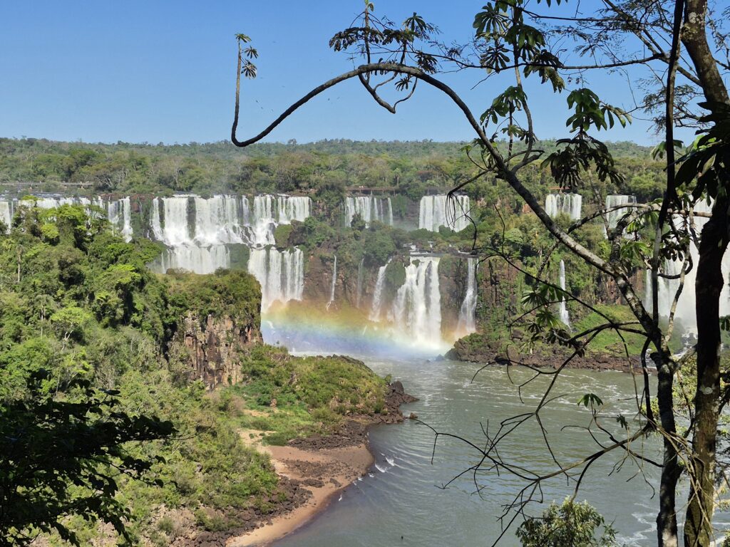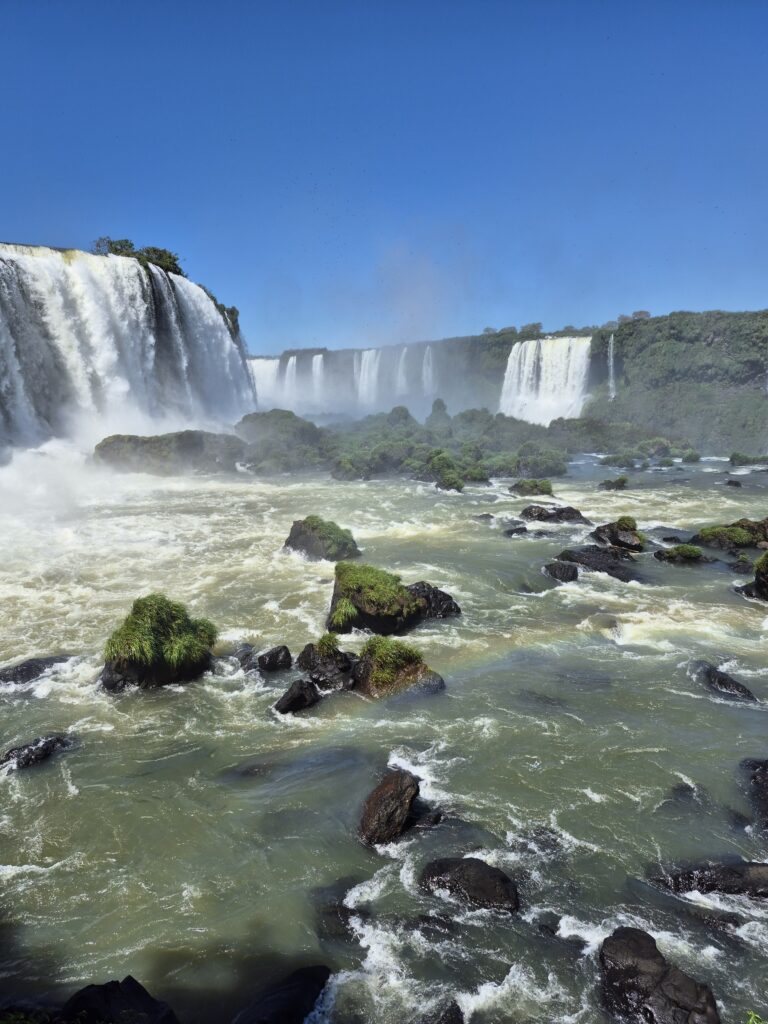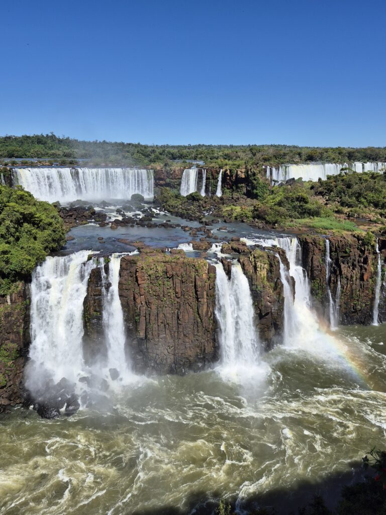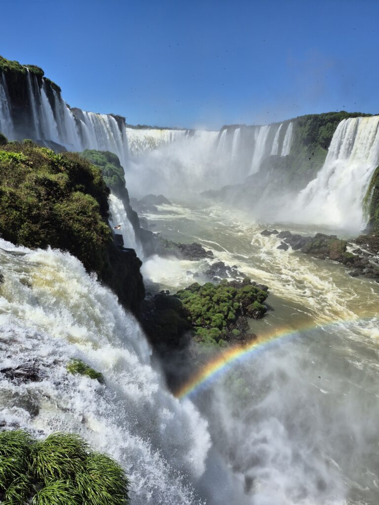 Une fois descendus du bus, nous commençons à emprunter la première passerelle. Là encore, nous avons la chance que la fréquentation soit faible, ce qui nous laisse du temps pour profiter. Petit à petit, le spectacle s’intensifie. De nombreux arcs en ciel apparaissent au pied des chutes d’eau, créant une atmosphère féérique, presque mystique. Plus on avance, et plus c’est beau. On ne nous avait pas menti, les chutes de ce côté sont magnifiques. On peut non seulement voir celles que nous avons la veille mais en plus, celles qu’on ne pouvait soupçonner. La passerelle nous conduit jusqu’au pied des chutes, où l’eau s’abat avec fracas, déplaçant l’air avec force et formant un nuage de gouttes d’eau rafraichissantes. On se croirait sur la côte normande en pleine tempête! Ici encore, la Nature nous offre généreusement ce qu’elle a de plus beau, de plus pure. L’eau, si abondante ici, donne à la végétation sa force et sa grandeur et me renvoie à mes pensées… Le merveilleux existe, il est là, devant nos yeux et sous nos pieds. L’eau est créatrice de toute vie, elle est partout autour de nous, en nous. Et nous avons une grande responsabilité : la préserver.