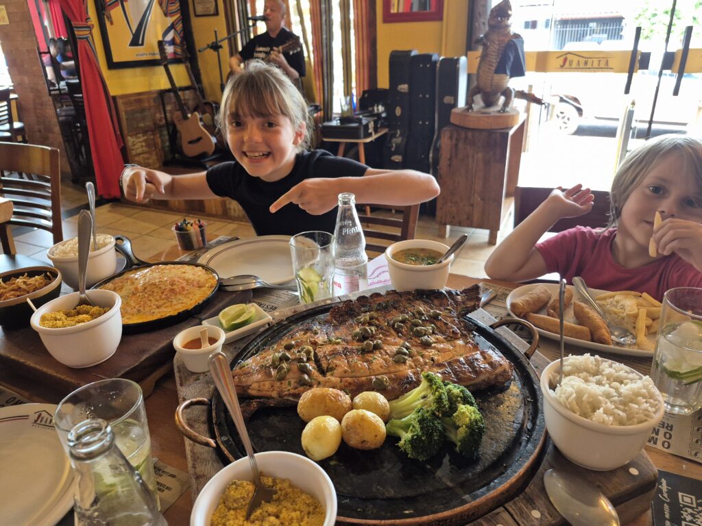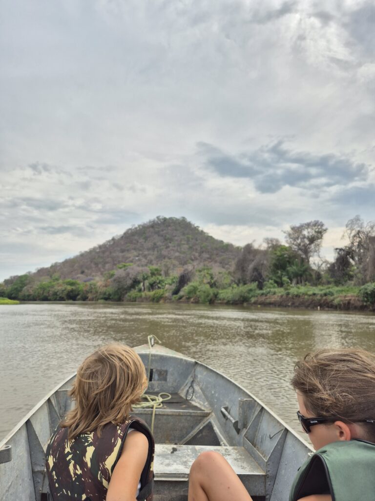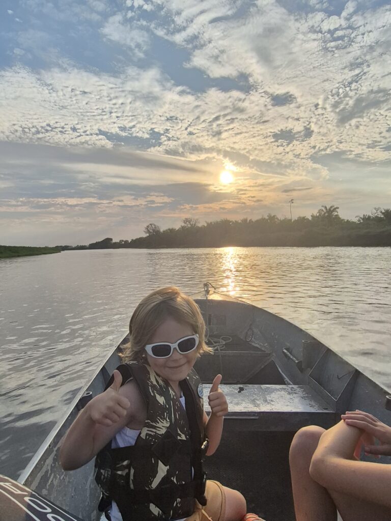 Nous avons passé 6h sur ce bateau, découvrant les paysages typiques du Pantanal. Les enfants ont eux aussi été fascinés par les paysages et les rencontres animalières. A la tombée du jour, la rivière s’est peu à peu transformée en un miroir géant, reflétant le rivage, les arbres et le ciel tinté de roses et de violets. Ce moment tout particulier m’a beaucoup émue tant c’était beau! Nous avons profité du voyage pour discuter avec Marcello de la vie locale et notamment du tourisme de pêche qui déstabilise l’équilibre fragile de cet écosystème. Des groupes entiers de pêcheurs louent des hôtels flottants et s’enfoncent dans le Pantanal pour pêcher, sur fond de musique forte et de consommation de nombreuses canettes de bières, sans trop se soucier du dérangement causé aux habitants du marais… Les enfants sont de plus en plus sensibles à ces problématiques et mesurent l’impact humain sur les espèces vivantes. Gaspard veut d’ailleurs se lancer dans la protection des animaux! Nous rentrons à la nuit, les lunettes de soleil mouchetées de guibets et la peau moite de l’humidité du marais. Nous avons tous conscience que cette expérience restera une des plus belles de notre vie. Nous fêtons cela autour d’un cocktail sur la terrasse de la Lodge.
