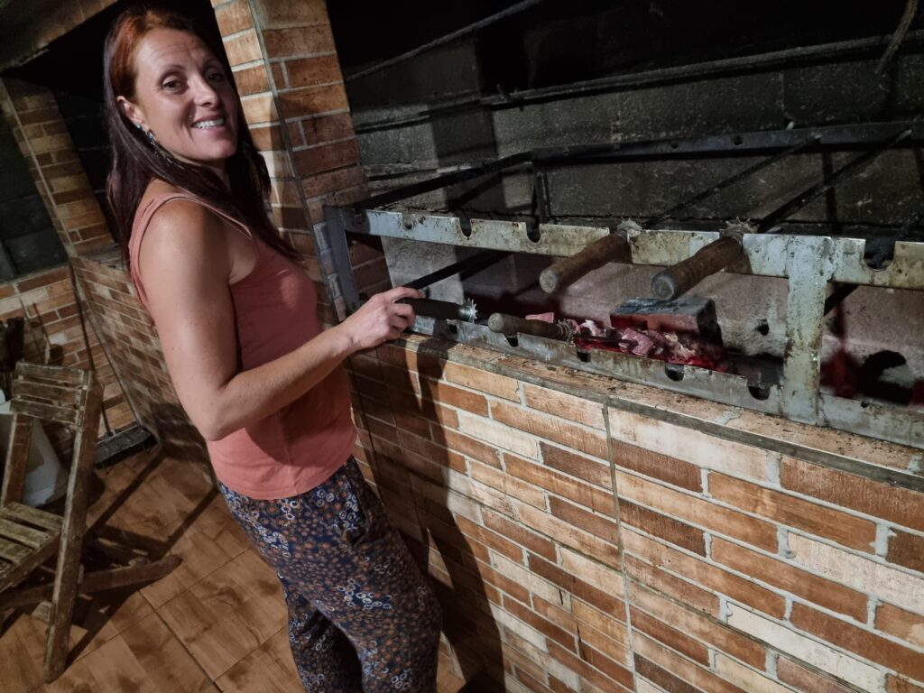 Belle surprise lorsque nous regardons le classement: Sylvain remporte la 6ème place au général (sur 111 coureurs) et 3ème de sa catégorie. Quant à moi, 79ème au général sur 228 coureurs, 28ème féminie et 11ème de ma catégorie…mon meilleur résultat! Après avoir assisté au podium, nous rentrons au camping préparer un repas pour José et sa famille. Je pensais leur faire découvrir des plats français mais j’avais omis le fait qu’on était dimanche et que tous les magasins étaient fermés. Heureusement, le propriétaire du camping a de la viande plein les congélateurs et me vend 2,8 kg de côte de boeuf et me trouve quelques patates chez lui. Avec ce que j’avais dans le camion, je prépare un repas complet « entrée-plat-dessert ». Nous faisons cuire la viande dans l’immense barbecue, à la brésilienne : sur des pics à brochette en métal qui ressemblent à des épées de près d’un mètre de long! C’est un grand plaisir pour moi de cuisiner pour des gens. J’en ai l’habitude en France et cela fait bien longtemps que je n’ai pas fait cela. Au moment de nous mettre à table, José prononce quelques mots de gratitude pour nous avoir rencontrés, auxquels nous répondons réciproquement. Il termine ce court échange en souhaitant bon appétit à tout le monde et je comprends à ce moment-là qu’il s’agit d’une tradition…comme une prière avant le repas. Ouf, je n’avais pas encore tapé dans mon assiette!!! Nous passons un excellent moment à nous remémorer la course et à échanger sur nos traditions culinaires et sociales avant de se souhaiter bonne nuit après cette journée éreintante et riche en émotions!